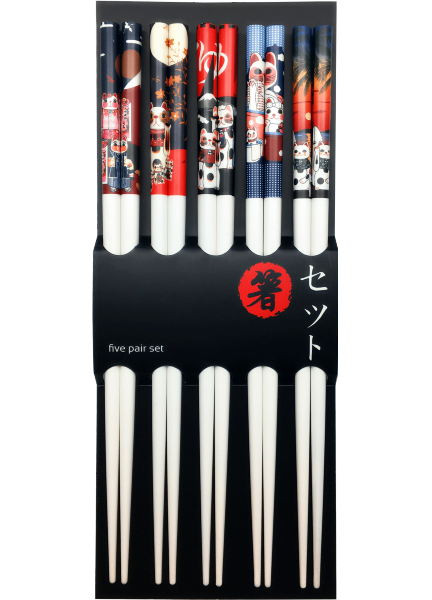 Zestaw malowanych, drewnianych pałeczek w kolorze białym, ozdobionych motywami kotów szczęścia Maneki-neko, przedstawionych w wielu harmonijnych wariacjach. Pałeczki utrzymane w tradycyjnym stylu, o gładkiej powierzchni i eleganckim wyglądzie, znakomicie prezentują się przy stole. Dzięki niewielkim wyżłobieniom na końcach patyczków chwytanie kolejnych porcji jedzenia będzie łatwiejsze również dla początkujących i średniozaawansowanych użytkowników.