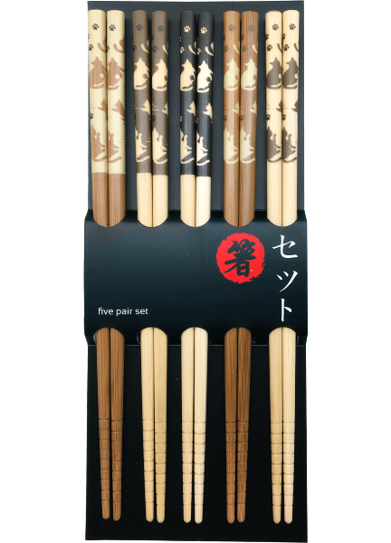 • Zestaw 5 par drewnianych pałeczek 22,5 cm zdobionych motywem kotów. Naturalne drewno, wygodne wyżłobienia i ciepła kolorystyka czynią je idealnym dodatkiem do kuchni każdego wielbiciela kuchni azjatyckiej.