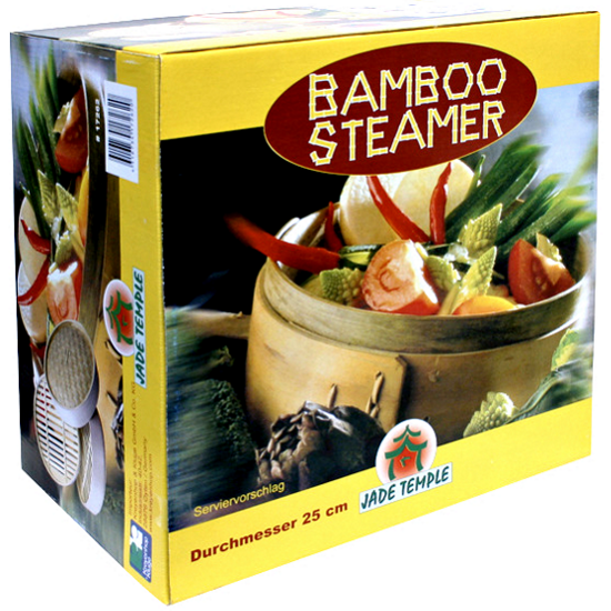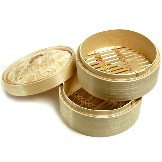 Okrągły parowar bambusowy z dwoma sitkami to bardzo popularne naczynie do gotowania na parze. W skład zestawu wchodzą 3 elementy: dwa sitka oraz przykrywka. Każdy element ma średnicę 20 cm. Parowar wyprodukowany przez firmę Jade Temple.